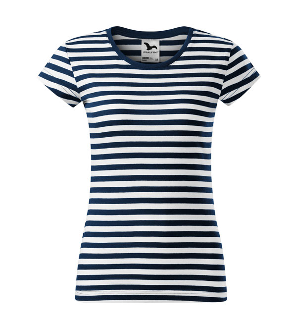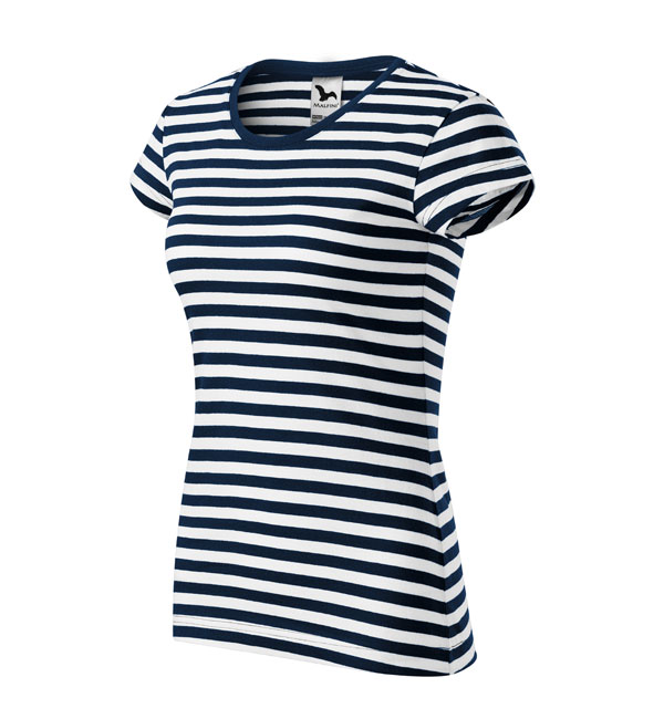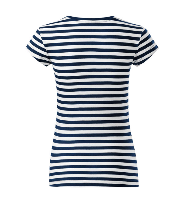 Koszulka wysokiej jakości w paski biało-granatowe. Kołnierzyk z dzianiny ściągaczowej z dodatkiem 5 % elastanu. Taśma wzmacniająca wokół szyi. Ramiona wzmocnione taśmą w kolorze koszulki. Dopasowany krój z bocznymi szwami. Bardzo krótkie rękawy.