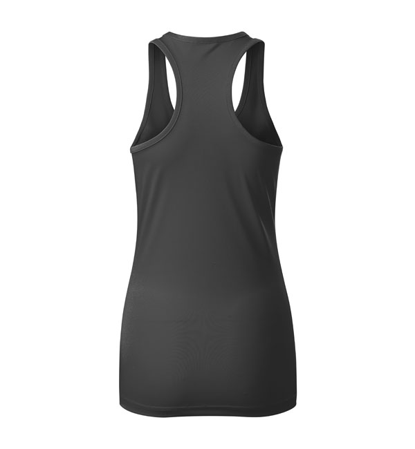Gładki szybkoschnący materiał; dopasowany krój ze szwami bocznymi; wcięcia przy łopatkach (racerback); szersza okrągła lamówka; dekolt oraz otwory wokół ramion wykończone lamówką z materiału wierzchniego; idealne do uprawiania sportu i aktywnośći fizycznej;