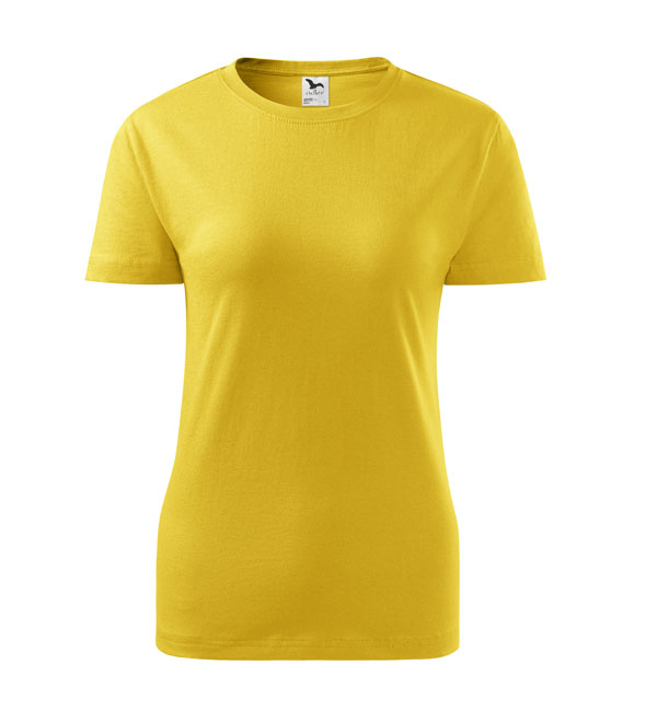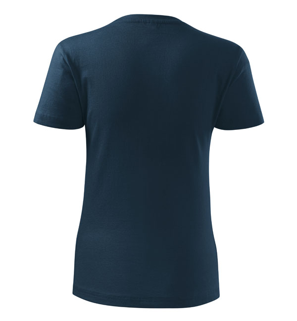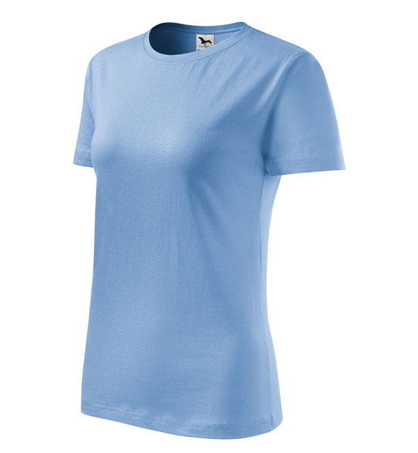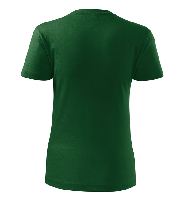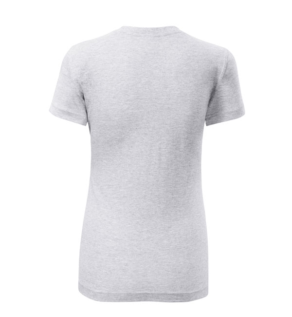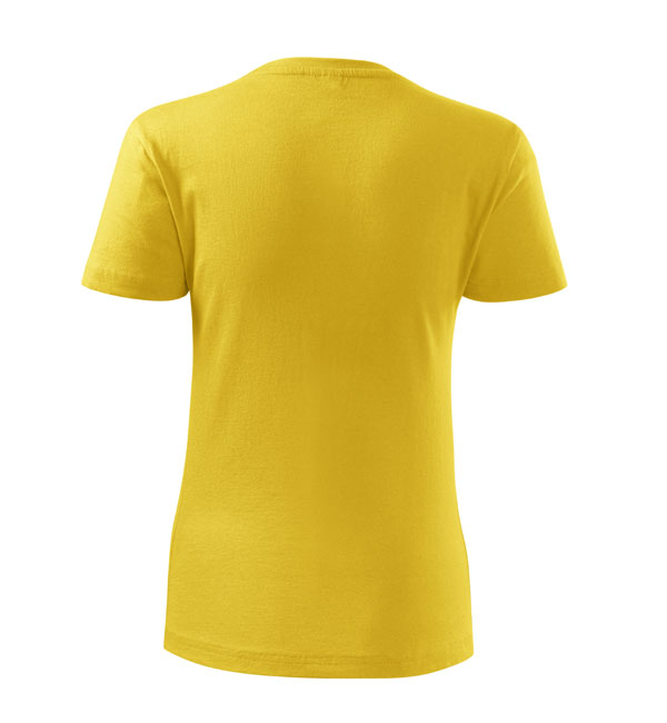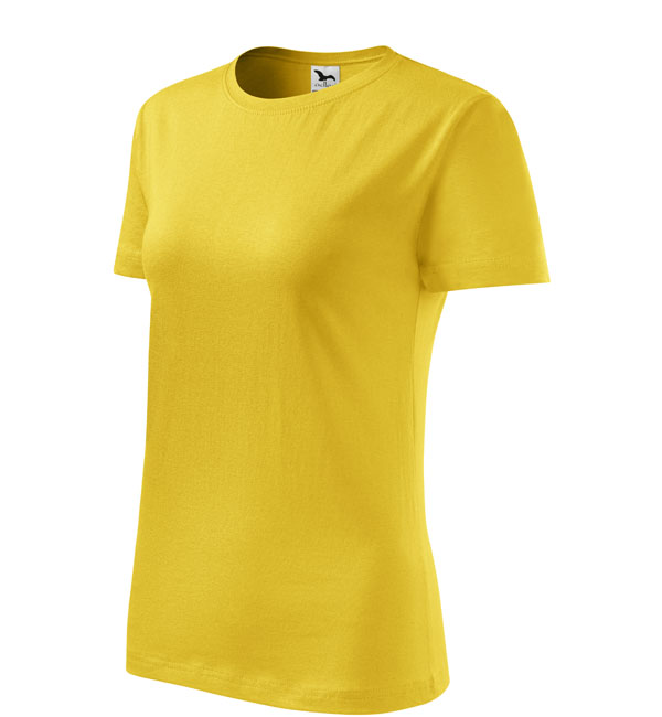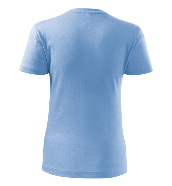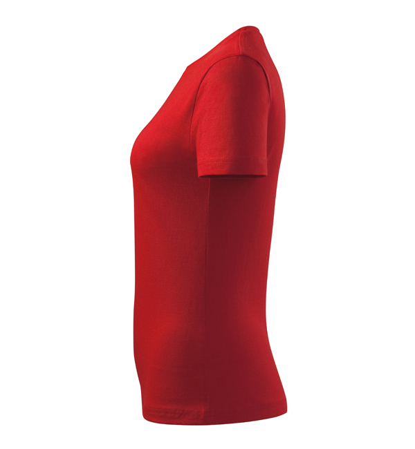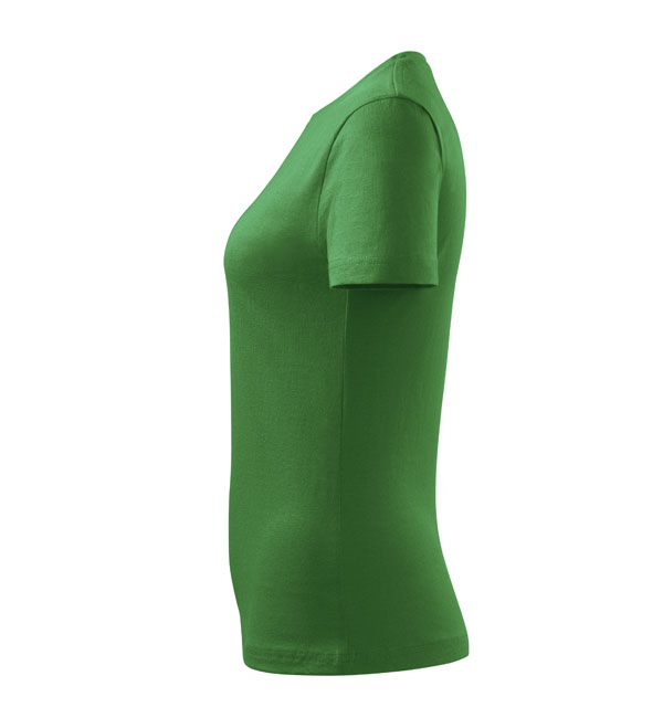 Koszulka damska wysokiej jakości o niższej gramaturze. Krój podkreślający damską sylwetkę. Wąska lamówka ze splotu żeberkowego. Węwnętrzna tylna część lamówki wykończona tkaną taśmą. Wzmocnienie na ramionach. Uzupełnienie męskiego i dziecięcego modelu koszulki Classic New. Świetnie nadaje się pod haft i nadruk.