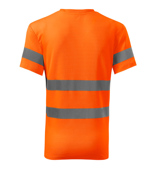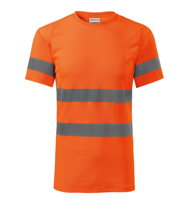 Koszulka unisex w kolorze fluoroscencyjnym z rekawai o kulisty kształt; okrągły dekolt z dzianiny ściągaczowej 1:1; krój z bocznymi szwami; naszyte certyfikowane taśmy odblaskowe 3M.
