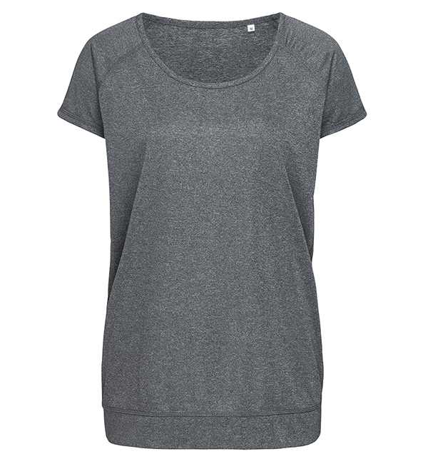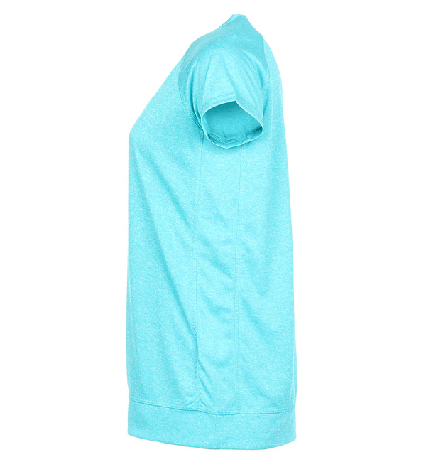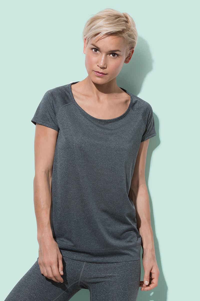Nowoczesne sportowe T-shirty dla kobiet, z raglanowymi rękawami, wykonane z szybkoschnącego poliestru z efektem melanżu, zapewniają pełną swobodę ruchu.