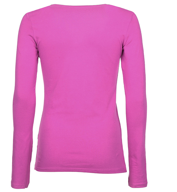 Dopasowany T-shirt z długimi rękawami dla kobiet, o modnej długości, wykonany z miękkiej i połyskliwej mieszanki bawełny i elastanu, z trójkątnym dekoltem i taśmą w kontrastującym kolorze na karku.