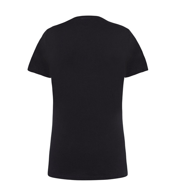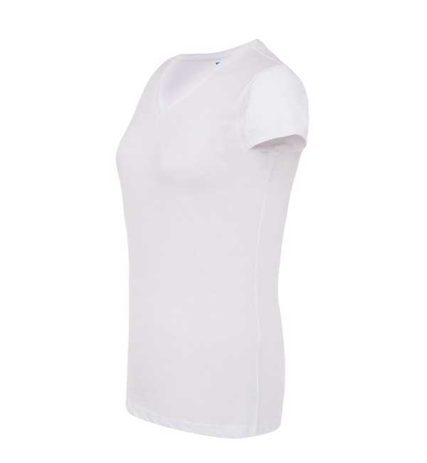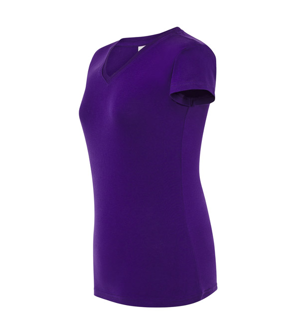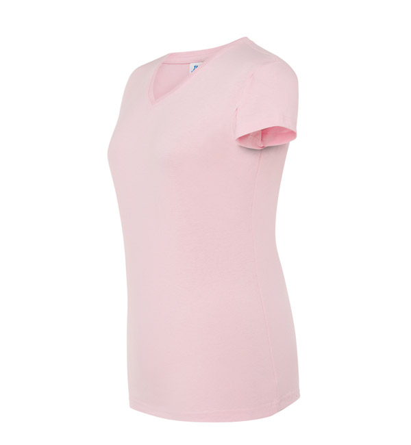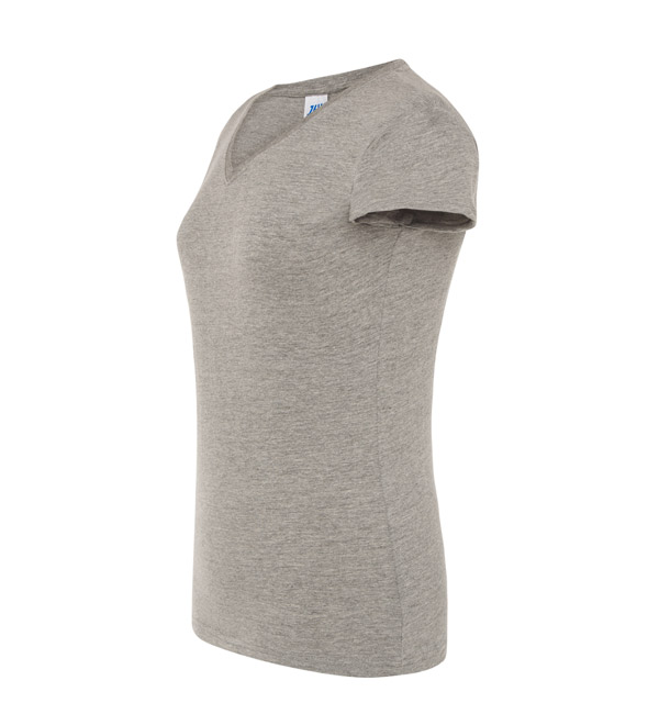 T-shirt damski z krótkim rękawem. Dekolt V-neck. Dopasowany krój. Szwy boczne. Dzianina single jersey