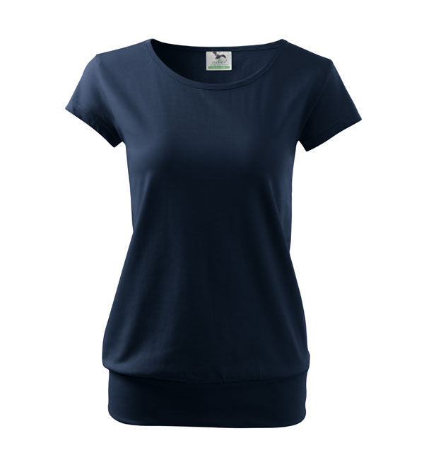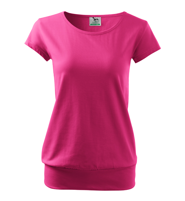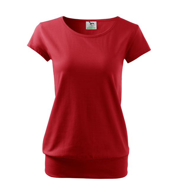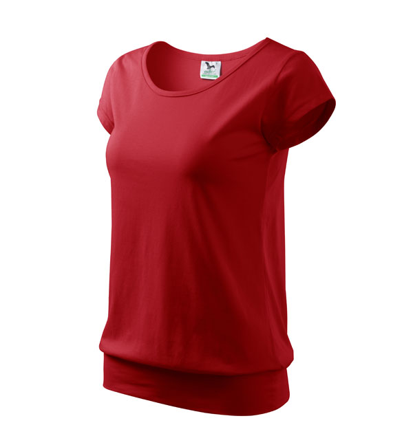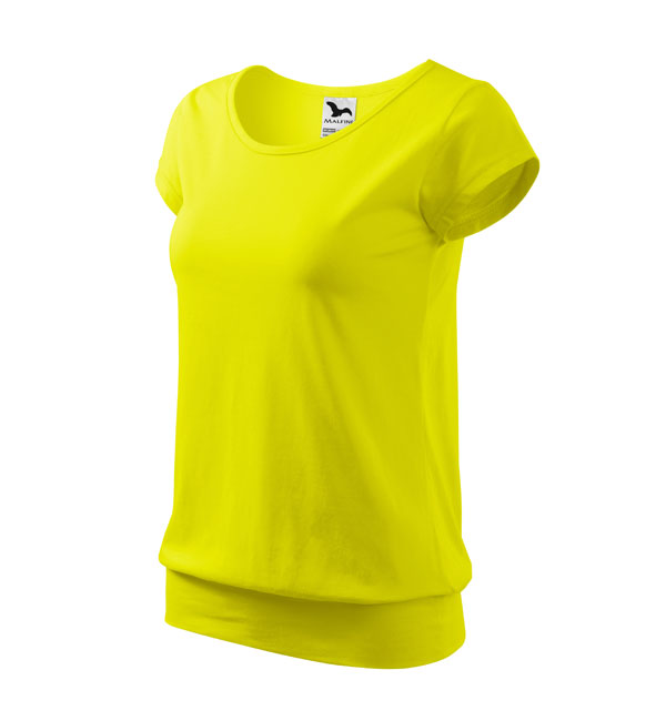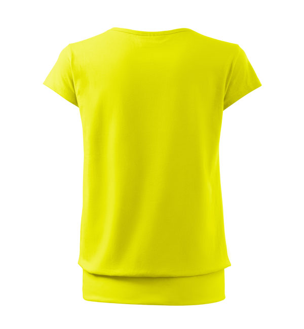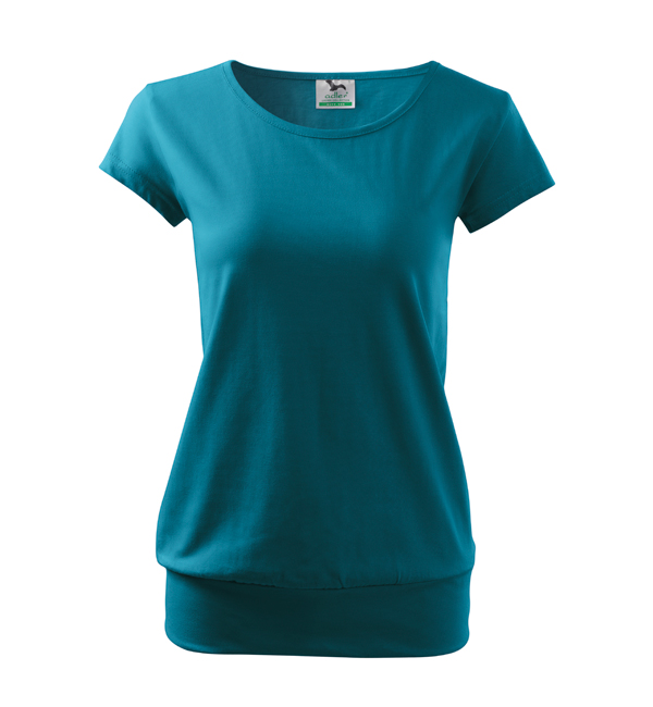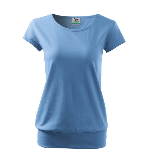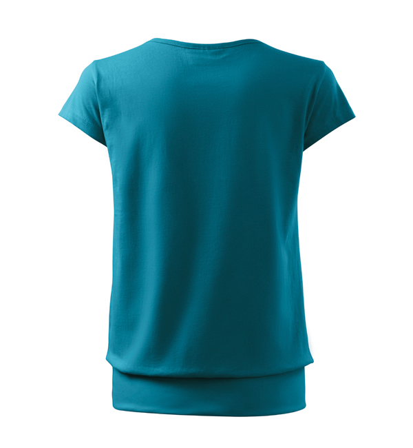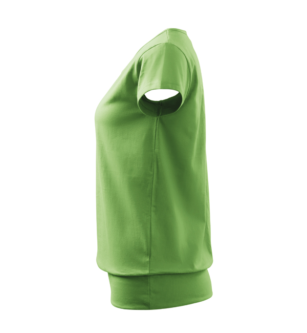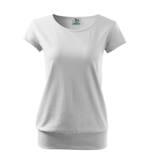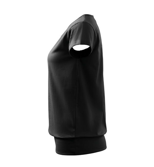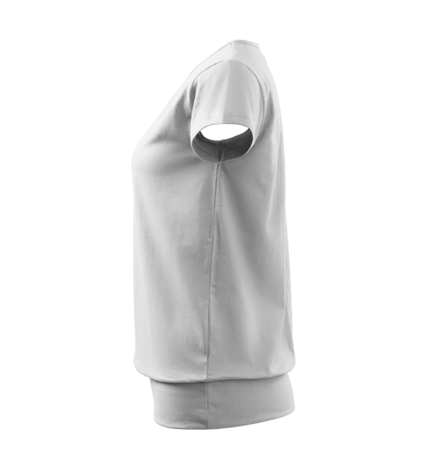 Modna koszulka damska z bardzo krótkim rękawkiem, krój niekrępujący ruchów, dolne brzegi wszyte w szerokie lamówki. Okrągłe wycięcie z wąską lamówką z tego samego materiału. Ramiona wzmocnione dzięki wszytym paskom. Długość koszulki – do bioder. Dzięki preparatowi zmiękczającemu tkanina jest delikatna i miękka w dotyku. Produkt doskonały pod haft i nadruk.