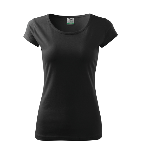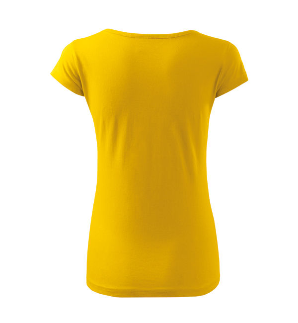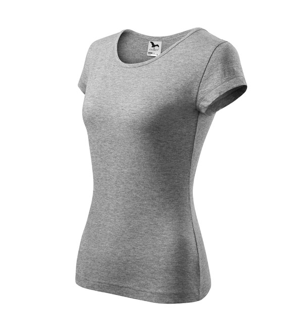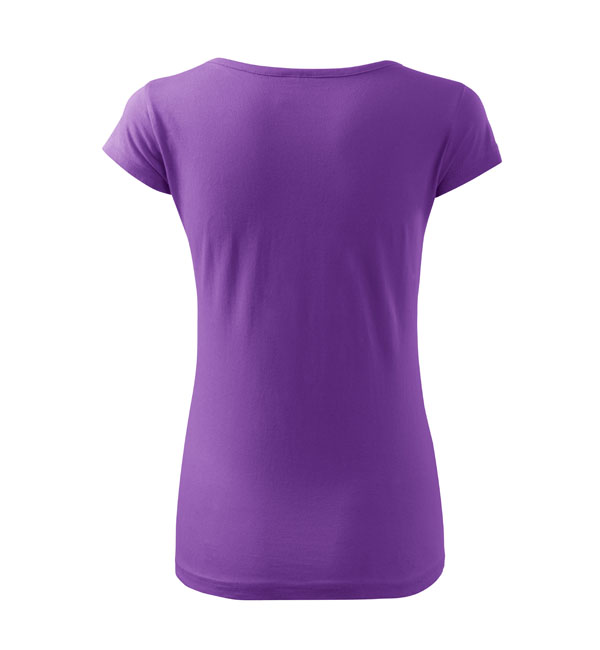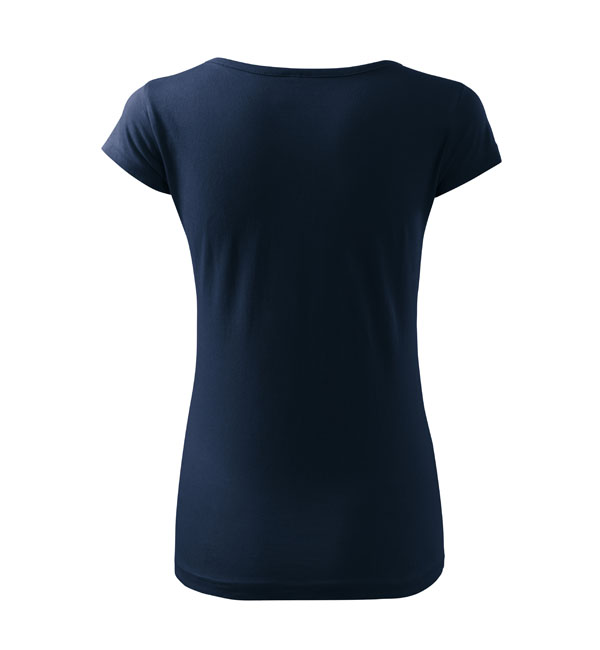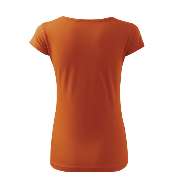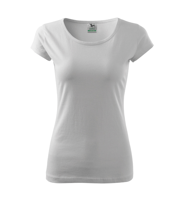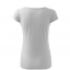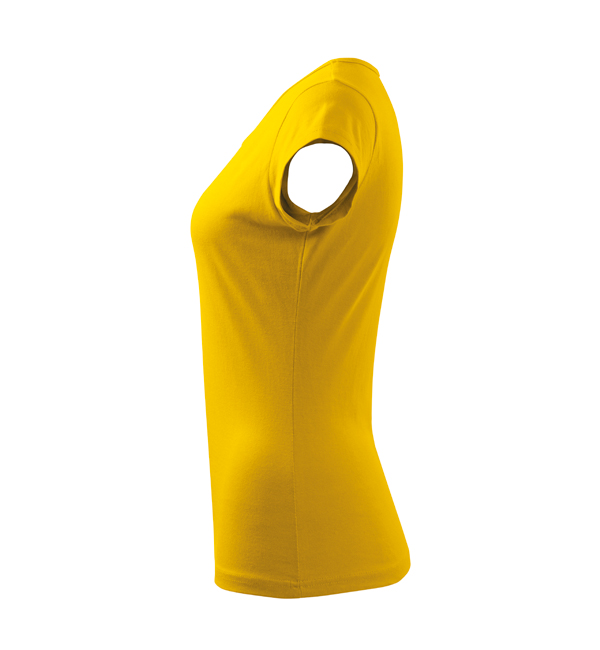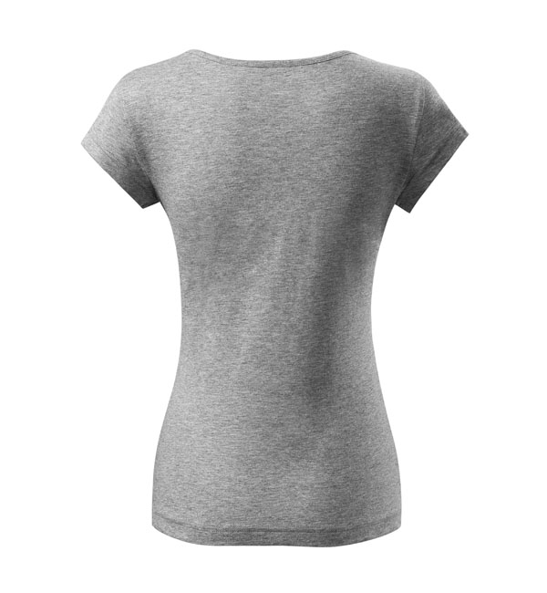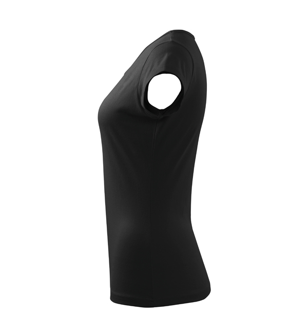 Koszulka damska z bardzo krótkim rękawem. Okrągłe luźne wycięcie z wąską lamówką z tego samego materiału. Ramiona wzmocnione dzięki wszytym paskom. Długość koszulki – do bioder. Dzięki preparatowi zmiękczającemu tkanina jest delikatna i miękka w dotyku. Produkt doskonały pod haft i nadruk.