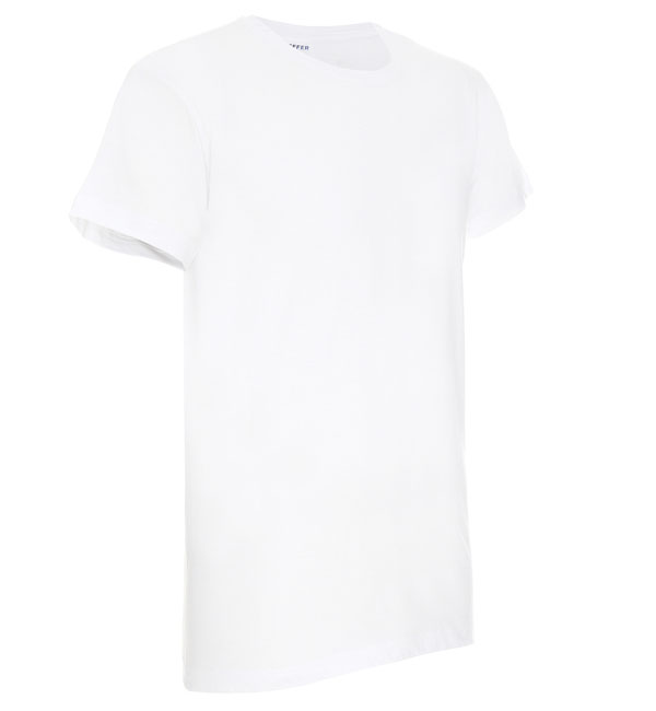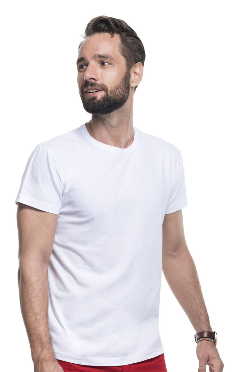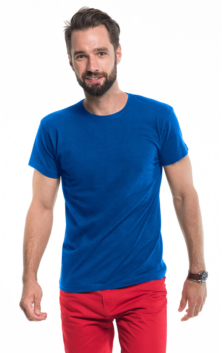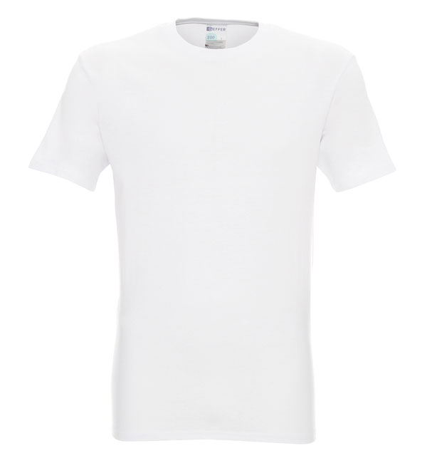 t-shirt z dzianiny single jersey; dopasowany krój; ściągacz wykonany z materiału głównego; boki bezszwowe; podwójne szwu; taśma wzmacniająca na karku; ramiona wzmocnione taśmą bawełnianą; 150 g