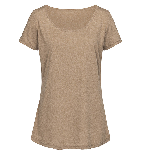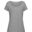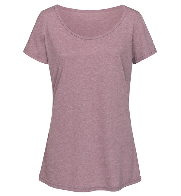 Modny T-shirt typu oversize dla kobiet wykonany z miękkiego i jedwabistego melanżu poliestrowo-wiskozowego z ciekawym nieobrębionym i szerokim dekoltem.