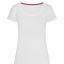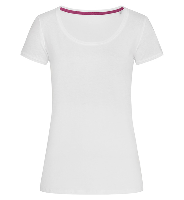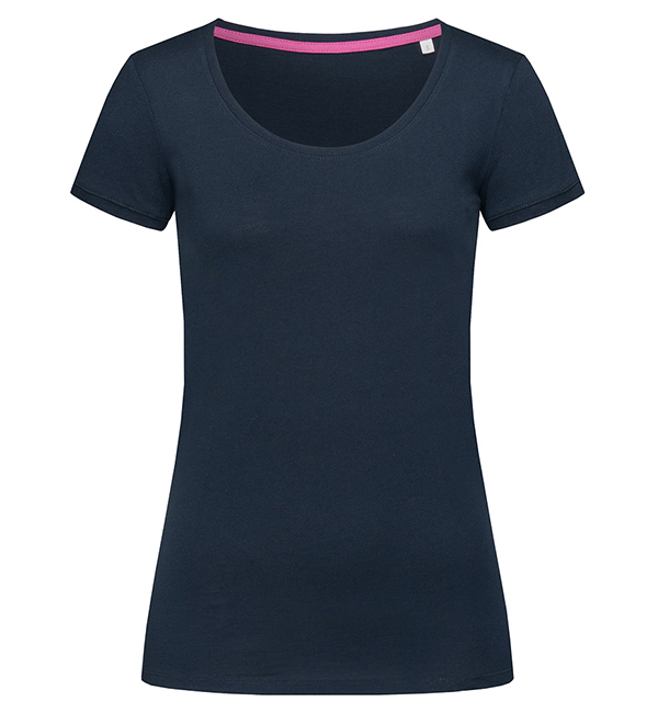 T-shirt damski ze 100% wysokogatunkowej bawełny jednołożyskowej. Modna długość, kontrastująca taśma przy szyi, modny wąski kołnierzyk z obszyciem i szeroki dekolt, krótkie rękawy z wąskimi ściągaczem. Etykietka z przepisem prania w szwie bocznym, maksymalna temperatura prania 40°C.